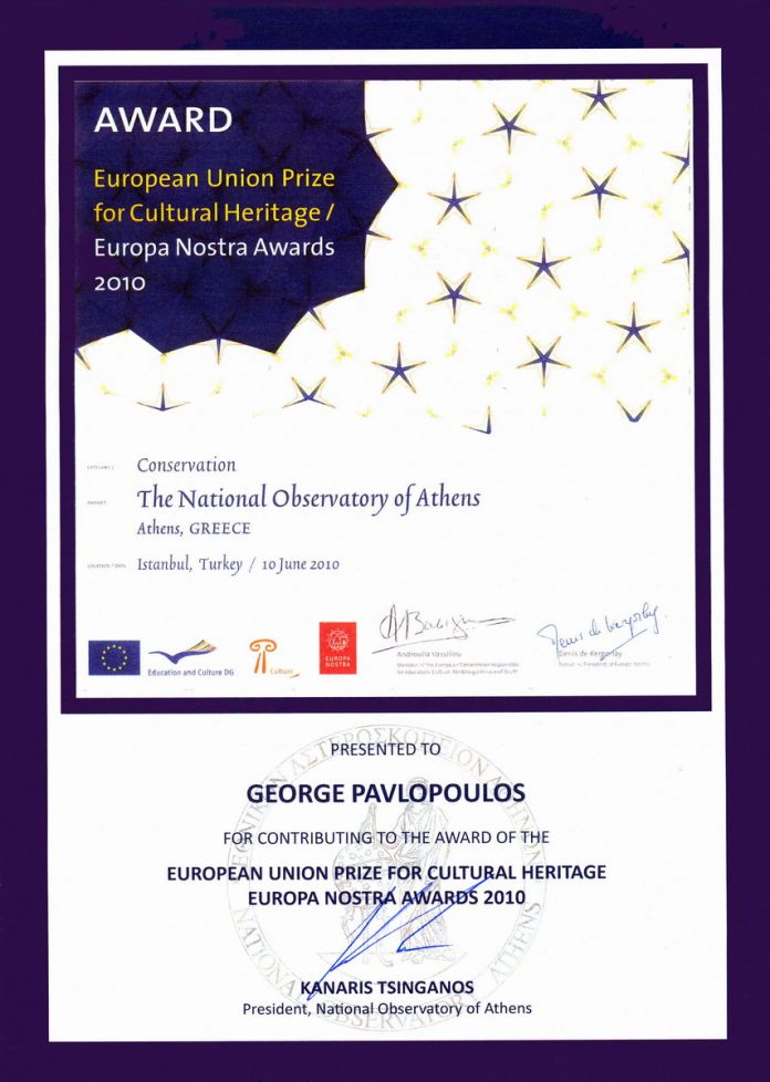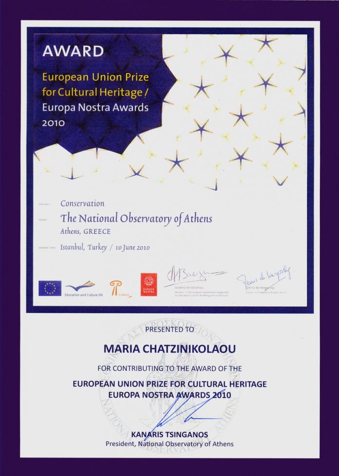 ΒΡΑΒΕΙΟ EUROPA NOSTRA 2010 ΓΙΑ ΤΟ ΕΡΓΟ:ΕΘΝΙΚΟ ΑΣΤΕΡΟΣΚΟΠΕΙΟ ΑΘΗΝΩΝ